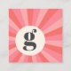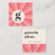 Modern, trendy, square business cards or personal profile cards with your monogram initial in dark grey on a cream coloured circle on a pink retro sunburst background. On the back are customisable template fields for your name and contact information. All colours can be edited in the design tool.