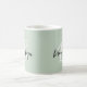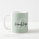 This elegant personalised coffee mug features a monogram and first name in modern black and white script on a sage green background.