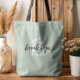 This elegant personalised tote bag features a monogram and first name in modern black and white script on a trendy sage green background.