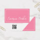 Influencer profile business cards with your name on the front in a trendy handwritten script font. Add your social media handle and website on the back and customize the QR code. Pink and white design. Colors can be customized with the design tool.