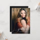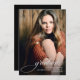 This trendy stylish graduation announcement features beautiful script text spelling out the word graduation with a text template to personalise with the name, school and graduating year. Load your desired vertical photo in place of the sample photo shown in the design template. The back of this announcement has been intentionally left blank. You can customise further by adding additional text on the back of the card if you desire.