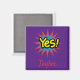 A trendy street art designed button, this item features "Yes" in yellow in black outline with a red and blue star symbol on a purple background. Your name is written in fun red font. Order yours today!