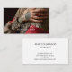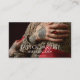 An elegant trendy style tattoo artist business card featuring white script typography and a glamourous photo featuring arm and hand tattoos. You may use this image or upload your own.