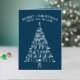 These trendy tree minimalist folded non-photo Christmas cards in navy blue with real silver foil printing are ready for you to make them your own. Easy to personalize, MERRY CHRISTMAS as well as your name in a graceful arch at the top and the year at the bottom serving as the trunk of the tree are all simple to edit with the provided text templates and will be printed in real silver foil on the deep navy blue background. The Christmas tree itself is a typography design of fun mixed fonts spelling out festive words from the holiday season on your custom folded Christmas cards - JOY, CHEER, HAPPY HOLIDAYS, MERRY, PEACE, HOPE, FA LA LA LA LA, HOLLY and JOLLY. These cute personalized Christmas cards open to reveal a pattern of simple light blue trees on a slightly darker blue background. A white area on the right hand panel contains an additional text template for your names and a custom holiday message in a dark navy blue font. Spread holiday cheer with a dash of elegant shimmer and shine with these custom folded non-photo holiday cards in navy blue and silver foil.