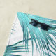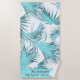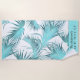 A great idea for your beach house or vacation home, this custom beach towel design has a fresh and trendy tropical palm frond pattern in cool icy aqua/turquoise blue over a white background adding the allure of the islands. The bottom portion of the towel has a matching band of colour with a text template for personalising with your family name or other desired text.