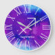 Trendy zodiac Sagittarius symbol wall clock featuring a pretty purple and blue space nebula design.