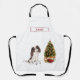 A Tri-Colour King Charles Spaniel dog is dressed for the holidays! Sporting a bow tie and red santa hat, this dog is ready. presents and a stocking are surrounding the Christmas tree.