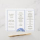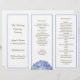 Tri-fold wedding program. Add your own text to the templates provided on this letterhead size (8.5 by 11 inch) linen paper. Each section has a blue border with one blue hydrangea flowers at the bottom of the middle section. Template text is dark green. Will fold into thirds accordion style. Reverse will have no printing. Shown on the heaviest - linen- paper which may be changed.