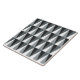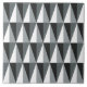 Rows of black, white and grey triangles form a three dimensional pattern.