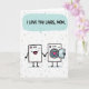 This design shows two friendly household appliances drawn with thick black outlines, standing close together on a white background patterned with faint gray triangles. The one on the left has a wide pink smile and an arm extended, gently holding onto its companion in a cozy, affectionate pose ❤️. The partner on the right has a round front opening with the door slightly ajar, revealing a red heart tucked inside like a sweet secret between close friends. Above them, an aquamarine speech bubble sits near the top and contains the message “I LOVE YOU LOADS, MOM” in dark, chunky lettering. The spacing keeps the words centered in the bubble, with the characters directly below so the message feels like it’s spoken to the pair. Soft pastel touches balance the strong pink and red accents, giving the scene a light, caring tone 🌼. The right figure’s open door angles outward, and the bright heart sits clearly in the middle of the circular opening.