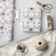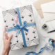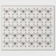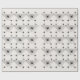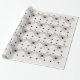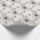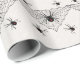 This wrapping paper roll is white with rows of triangular shaped black spider webs with black widow spiders with red hourglass markings.