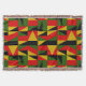 This throw blanket has a Black History design of triangles and rectangles in gold, red, green, and black making a pattern.