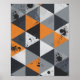 A striking geometric design featuring a pattern of triangles in various shades of grey, black, white, and vibrant orange. The design is enhanced with artistic textures, including paint splatters and creative effects, creating a unique and expressive feel. This bold and edgy artwork is ideal for modern home decor, apparel, or graphic design projects, offering a dynamic and stylish visual.