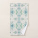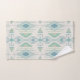 This bath towel set features a geometric tribal pattern of arrows and diamonds in sea glass, sage, blue and cream for a boho look.