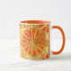 Coffee mug in a modern tribal / ethnic print of nested mandala wheels and triangles, with a tropical feel - shades of orange and gold, from deep mandarin to light pineapple yellow, accented with soft, leafy greens