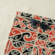 This pretty beach towel has a traditional Maori tribal print in shades of black, red and ecru. This kowhaiwhai koru spiral motif was made in New Zealand. For this towel, the antique Polynesian design has been completely redrawn and made into a repeating pattern. Use the template to easily add your name to the band of red.