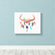 Watercolor colourful bull skull with horns, flowers, and feathers on a white tribal pattern