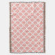 A geometric tribal key and angular cut out style patterned throw in warm coral orange pink and white, or select your own background colour. Designed by Sarah Trett. Would look great in a bedroom, lounge.