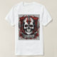 A bold, tribal skull, its red eyes glowing intensely, dominates this dark and mysterious artwork. Intricate geometric patterns and feather-like textures adorn the skull, while vibrant orange and dark purple shapes swirl around it. The hanging banners on either side add to the skull's intimidating presence, making it a striking piece for lovers of gothic and tribal art.
