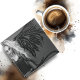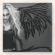 A white haired red eyed angel with black tribal wings all in shades of black and white