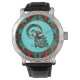 This is a Unique "One of a Kind" Tribal Wolf Watch! It Features a Southwest Tribal Wolf Howling at the Moon on a Turquoise Background...Surrounded by a Turquoise, Orange and Black Border!