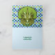 Easily personalise this cute birthday card featuring triceratops faces in green and blue along with colour coordinated polka dot and tartan patterns.