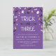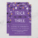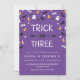 Cute, spooky purple Trick Or Three Halloween birthday party invitations with confetti of ghosts, eyeballs, candy corn, bats and witches' shoes & brooms. Trick or Three is surrounded by the confetti; below is the personalised party invitation text. You can even change the background colour yourself by using the Customise / Personalise tool.