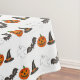 Tablecloth features an original marker illustration of a Halloween witch, bat, jack o' lantern pumpkin, and spooky ghost.