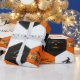 Black, white and orange hexagons pattern with Halloween elements, witch silhouette, a dark jack-o-lantern and a Happy Halloween sign.