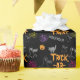 "TRICK-OR-TREAT". Featuring jack-o-lanterns, a black (grey) cat and ghosts saying "BOO!"