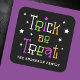 Square Halloween stickers featuring the text: "Trick or treat" in white, orange green and purple letters surrounded by stars. All colours are customisable in the design tool. Use as envelope seals, stickers for gifts and favours, product packaging, crafts and scrapbooking etc