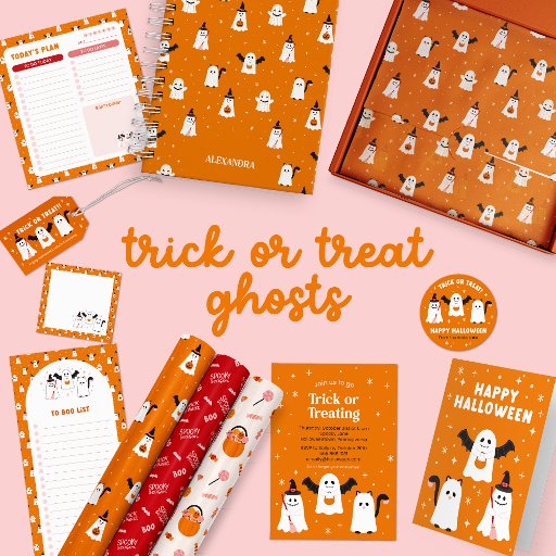 Personalised Weekly Planner with a Spooky Cute Halloween pattern, with trick or treating ghosts dressed as witches, bats, cats and pumpkins.