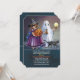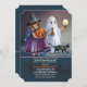 A beautiful, watercolor Halloween invitation featuring a cute little witch and a ghost companion on their way to trick or treat.