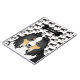 Destei's original cartoon illustration of a cute tricolor Shetland Sheepdog / Sheltie breed dog. The dog design is placed as a background pattern and as a large portrait of the dog's head. There is also a black dog bone shape silhouette that has a personalizable text area for a name or other custom title.