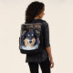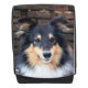 Beautiful tricolor Sheltie, or Shetland Sheepdog, face with a matchingly coloured brick wall for a background dog lovers back pack