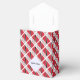 Personalised tent shaped favour box showing the red, white and black Trinidadian and Tobagonian flag with the words TRINIDAD AND TOBAGO below. Design is tiled for an artistic look. A white fractal of squiggly squares provides a place for a name for personalisation. Fun for family reunions, travel groups, and clubs.