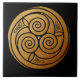 Dramatic black and gold intricate triple Celtic knot swirl mandala. Eternal spirals and trinity knots in gold on a black background.