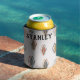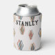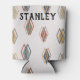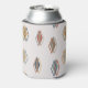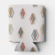 This can cooler has a mid-century modern design of sets of two diamond outlines with one solid diamond, in greys, gold, orange, blue, and tan, scattered about the design on a field of off-white. If you like the design but prefer different colours, message me.