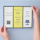Tri-fold brochure template in dark blue, yellow and white. Include a personal photo for the "about" section, a QR code, and logo as needed. The blue tree image on the front panel can become your logo. Neutral colours grab attention and work for nearly all types of businesses. Customise with header text and smaller print on six panels between two sides of 8x11 inch paper. Changing the paper size may alter the design to not fit properly.