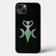 A beautiful Spiral Goddess between two crescent moons, creating a Triple Goddess. She appears as if made from frosted glass in shades of green, and purple tribal armband. The Triple Goddess represents the three cycles of womanhood: The Maiden, The Mother and The Crone.