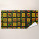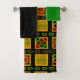 This towel set has a green washcloth, a black hand towel, and a bath towel with a Black History design of circles, triangles, diamonds, lines, and zigzags forming a pattern.