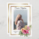 Simply elegant boho watercolor tropical floral gold frames four photo collage graduation announcement design by Holiday Hearts Designs. Template placeholder photos courtesy Unsplash.