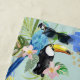 Abstract shapes and squiggles match up with tropical foliage and toucans and parrots. Cheerful colours of aqua, green, hot pink, sunny yellow, and black and white make a multicolored palette.