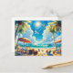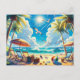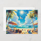A vibrant and colourful beach scene under a bright, sunny sky filled with fluffy white clouds and seagulls soaring overhead. Palm trees line the foreground, their leaves gently swaying in an ocean breeze. Two beach chairs are strategically placed beneath spacious umbrellas, offering shade from the sun. A variety of beach items, including a colourful beach ball, starfish, and seashells, adorn the sandy shore. The calm ocean waves roll gently towards the beach, reflecting the sun's golden rays. This idyllic setting conveys a sense of relaxation and summer bliss.