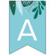 Surfs up! Tropical surf themed baby shower bunting with a natural wood grain surfboard and tropical leaves in shades of aqua and green.