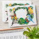 Cute tropical themed envelope featuring adorable exotic parrots and botanical tropical greenery.