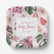 Tropical Baby Shower Paper Plates. Serve your guests in style with our square paper plates featuring a tropical pattern. The lush green palm and monstera leaves, vivid magenta and fuchsia orchids, and delicate blush pink hibiscus flowers add a cohesive and festive flair to your table settings, ensuring every detail is perfectly coordinated.