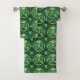 Tropical bath and wash towels with vibrant green and yellow palm leaf patterns on black circular backgrounds, creating an energetic, nature-inspired look.