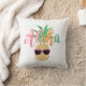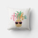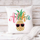 Tropical, fun throw pillow featuring a cute, smiling pineapple wearing sunglasses with an Aloha greeting in summery beach colours (pink, coral, orange, aqua blue). Original artwork KL Stock.