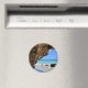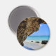 A magnet with a scenic nature photograph. Beautiful turquoise blue sea with a sandy beach. A big brown rock provides some shade from the bright blue sky.